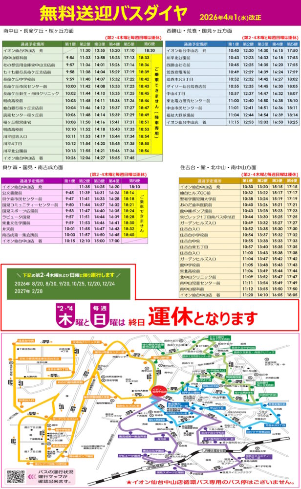 2026/04/11 イオン仙台中山店 無料送迎バス 運行日変更について 2026年4月1日(水)以降、原則、毎月第2・第4木曜日と毎週日曜日は終日運休となります。※下記の第2・第4木曜日および日曜日に限り運行します。2026年 8/20、8/30、9/20、10/25、12/20、12/242027年 2/28
